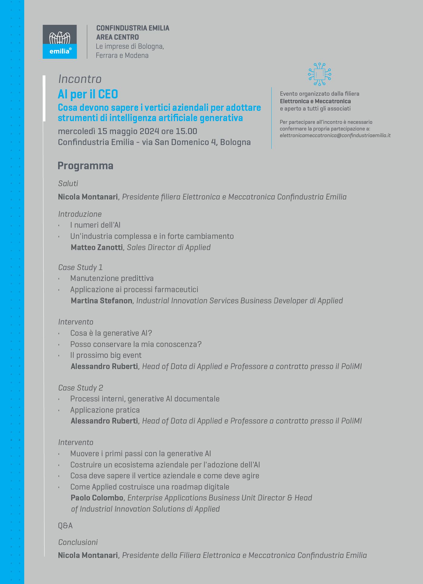Lo scorso 15 maggio, Applied ha partecipato all’evento di Confindustria Emilia Area Centro, “AI per il CEO. Cosa devono sapere i vertici aziendali per adottare strumenti di intelligenza artificiale generativa”, dedicato ai CEO del settore manifatturiero.